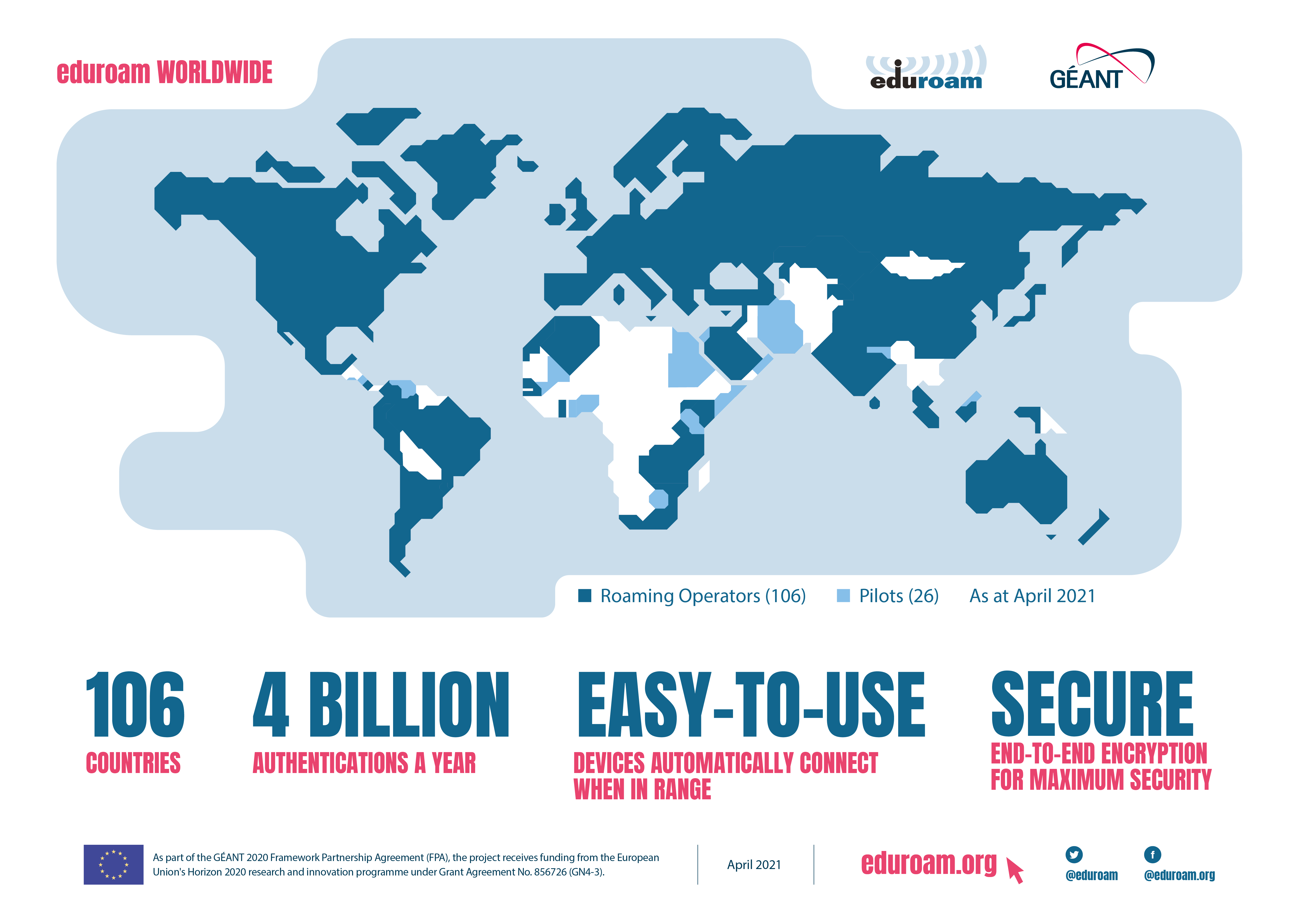 Having started in Europe, eduroam has gained momentum throughout the research and education community and is now available in over 100 territories. eduroam is available in thousands of locations across over 100 countries worldwide. From campuses to coffee shops.